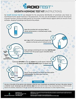 The Growth Hormone Test Kit utilizes GH antibodies to identify real growth hormone (somatropin) in GH products. It is incredibly accurate. This also means that it is not fooled by common GH-elevating peptides such as GHRP-2, GHRP-6, and Hexarelin, which are widely used to make GH counterfeits. These peptides are much cheaper than somatropin, but may still result in serum growth hormone elevations. They may be able to fool a blood test for growth hormone level, but not ROIDTEST™.